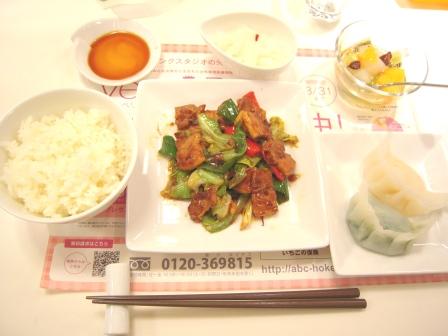 メニューは回鍋肉、蒸し餃子、大根の甘酢漬け、ジャスミンティーのフルーツカクテルでした。
