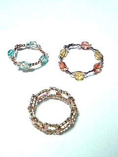 特に今回の上の二点は途中でビーズを入れてねじっただけだけなのでとっても簡単ですが、固いワイヤーを使うと結構ねじるのに力が要るので右側のものはワイヤーの種類を細くしてみました。そして、後から気づいたのですが、下の指輪はテグスで作った方がよかったようです。