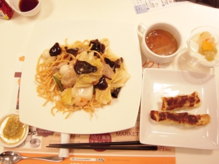 今回はねぎ塩ダレを作って、それを活用して、白ねぎのスープ、五目かたやきそば、ねぎ塩棒餃子を作り、デザートにはフルーツ杏仁を作りました。