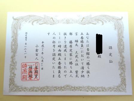 こちらも余裕で5人の歌人に勝てて、上の小さな賞状をいただきました。